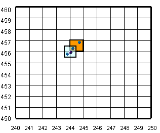Consider a summit with a 6-figure grid reference quoted as NN 244 456, and assume you have a very large scale map so that you can impose a detailed grid. Within the 100 km grid square NN, you identify the matrix point at an Easting or 244 and a Northing of 456, the centre of the pale blue square in the accompanying diagram. (Note: this diagram is fictitious, and does not correlate with anywhere on the Black Mount) Around this intersection there are four summits, marked as solid dots. Following the instructions with 1:50 000 maps, estimating tenths eastwards and northwards implies that summits are given the grid reference of the nearest matrix point, that is the three dot summits in the pale blue square would be given the grid reference NN 244 456.