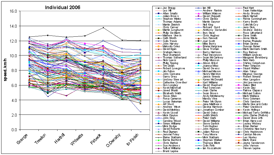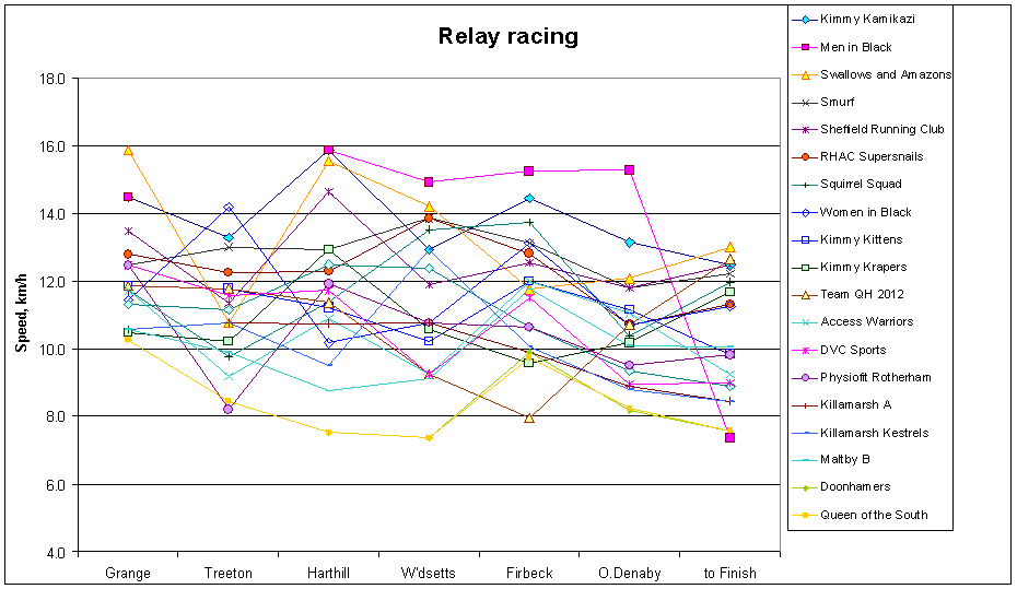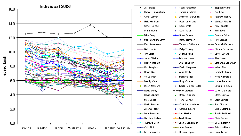 Time was only recorded to the nearest minute at intermediate checkpoints, and therefore 12.2 km in 57 min could be 12.3 km in 56 min, presented as 12.84 or 13.18 km/h respectively.