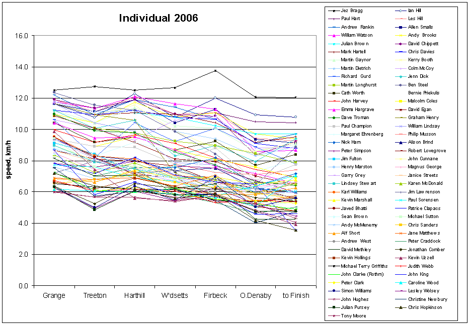 This graph shows how Jez ran compared to the rest of us - he kept up a good speed all the way. Stage 1 to Grange has more climb than any other stage, and Stage 4 has the long section across fields (and more fields). The first 20 or so (one of a group that kept together) are show, together with other random participants. Note, those who were out in the dark towards the end were necessarily slowed.