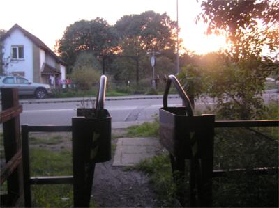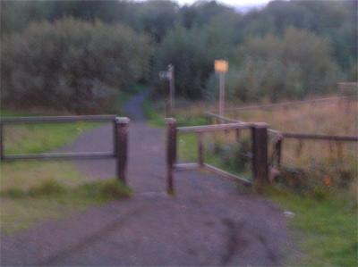 Cross RD, under metal arch, after 200 m bear L, signed Elsecar, on narrow path, |